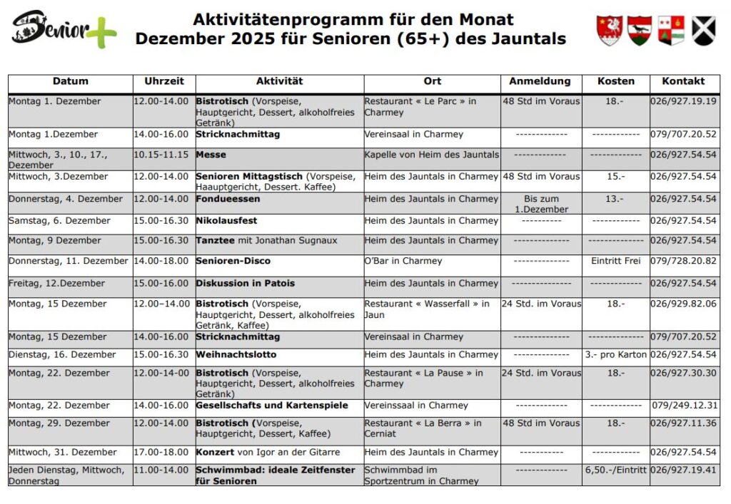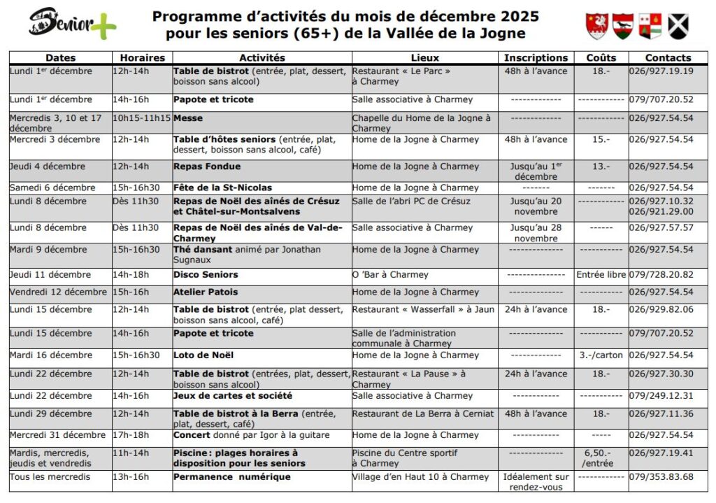 Sénior + Vallée de la Jogne – Programme du mois de décembre 2025